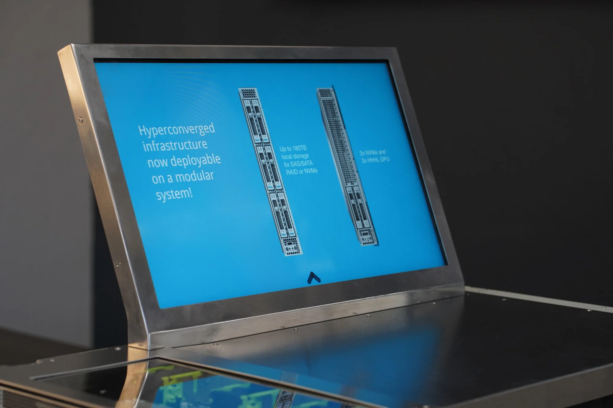 We further infused the unit with interactive features in the form of two touchscreens. The first is a side screen to showcase an inside view of the system. The second is a main screen to feature infographics of the system's hardware and software capability. The main screen also synced to the removable components to display pertinent information about them when touched.