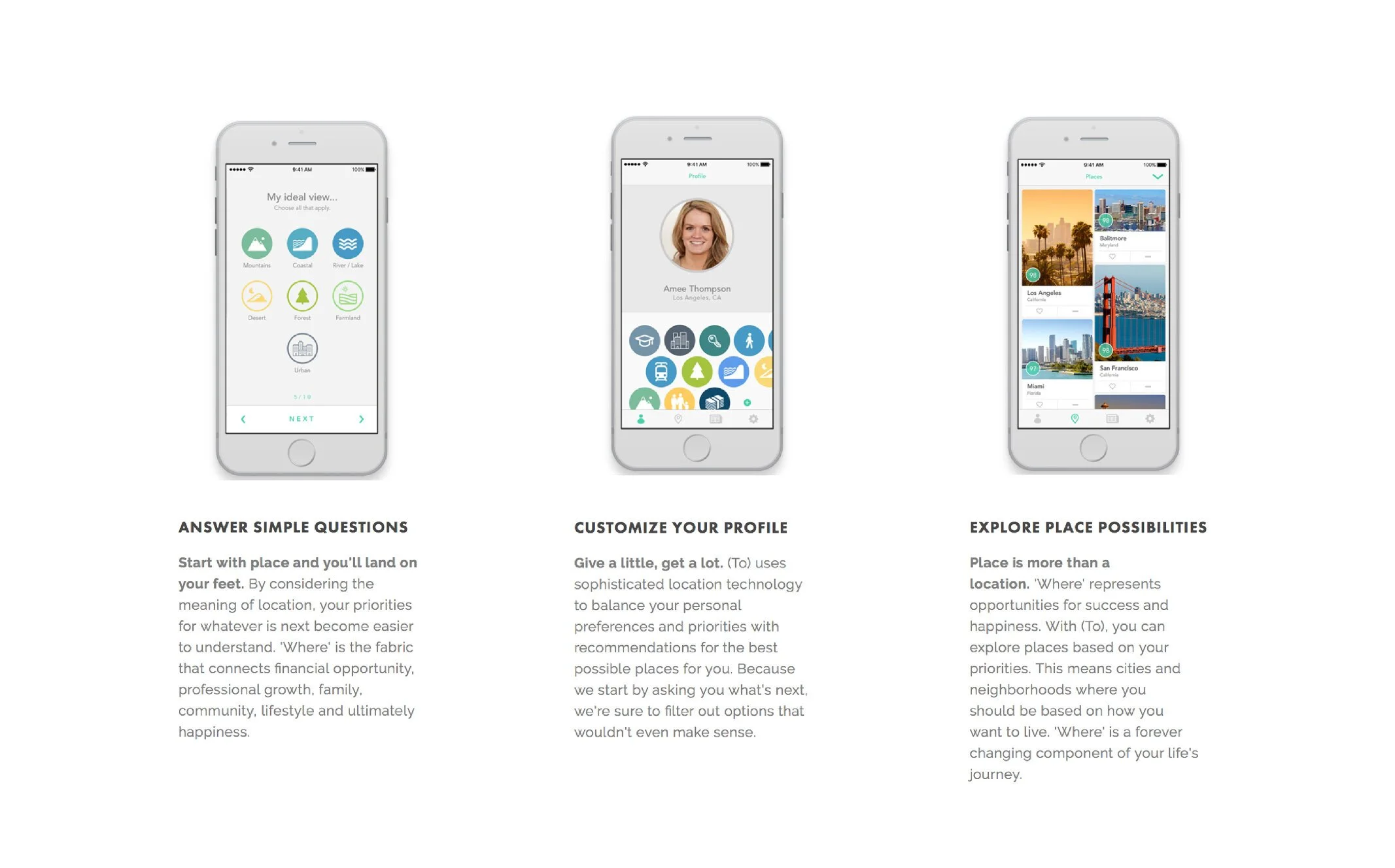 Sarah Linden and I started with the idea of bringing the power of location to the consumers that were making location-based life decisions. We turned this idea into a mobile platform called (To). This geo-location based app helped people match a career path with their desired lifestyle as the leading factor. As part of the founding team and the lead creative & UI/UX designer, I worked closely with the business team and technical developers to turn this vision from concept into a consumer product on the iOS app store.